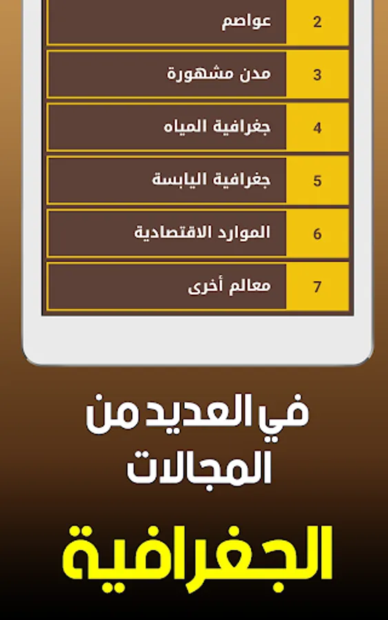 * The competition included the geography of the Arab world with great focus, as it included all the famous cities, ports, all the rivers, bays, islands, borders, mountains ... etc. and in all Arab countries.