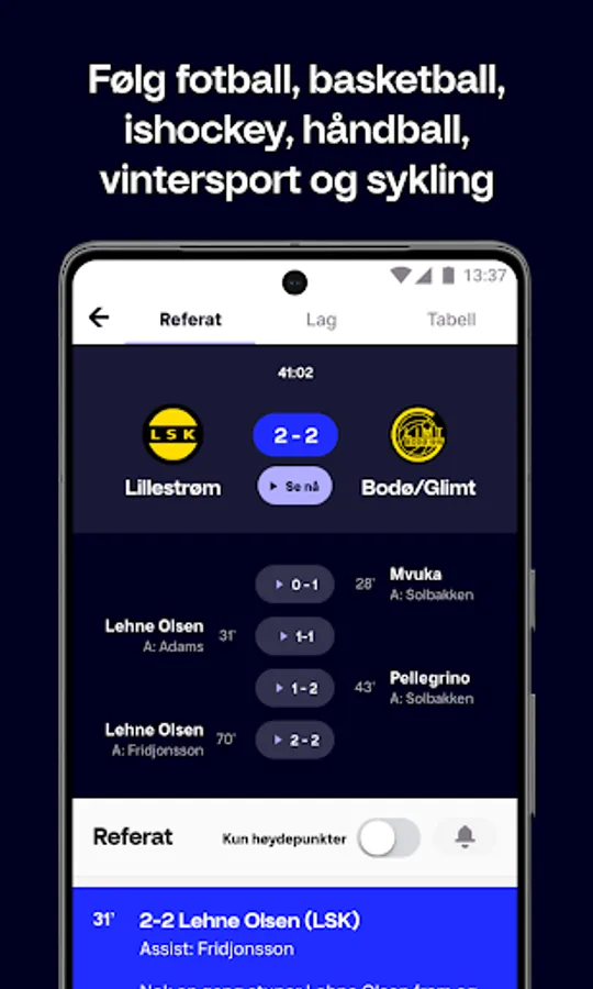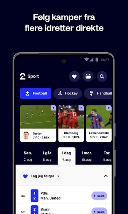 At the same time, we continue the best from TV 2 Sporten's old sports app. Navigate among all the major clubs and national teams in the world. Check when your team is playing matches - and find out which channel is broadcasting it. Also get schedule lists, team lineups and results from all the world's leagues in handball, ice hockey and football. In addition, we offer winter sports and cycling.
