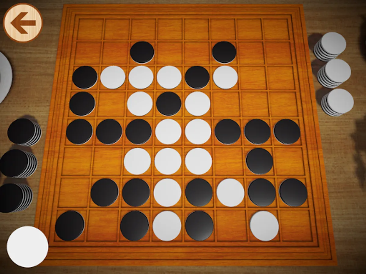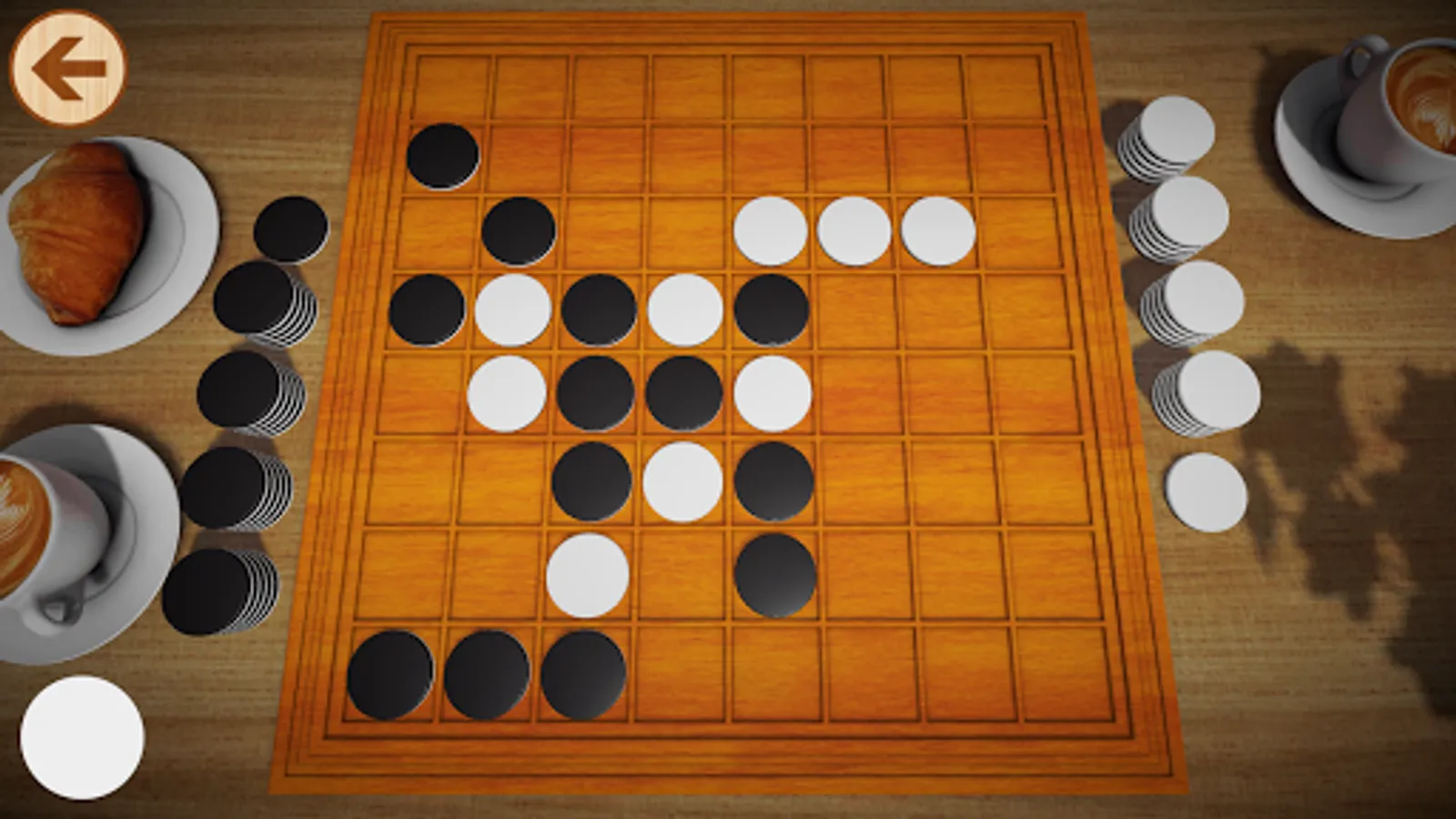 This game uses the same rules as othello and is similar to reversi. Each player takes turns to place down a disc in an empty position, where at least one opponent's disc can be captured and flipped over. An opponent's disc can be captured if it is in between the newly placed disc and another disc of the same color. This can be horizontally, vertically and diagonally. When a player can't make any valid moves, they skip their turn. The winner is the player who has the most discs flipped over to their color, at the end of the game. The circle in the bottom left corner indicates which player is currently making their move.