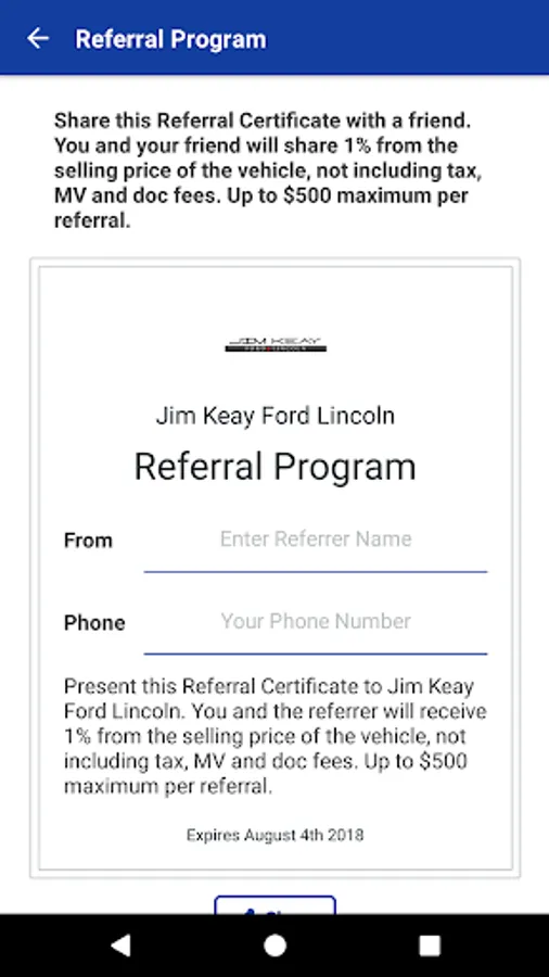 Jim Keay Ford Lincoln mobile customer engagement app provides customers with a wide range of features/benefits, including scheduling a service appointment, viewing new and used inventory, redeeming mobile offers, sharing dealer promotions, viewing special events, referring new customers, redeeming loyalty rewards, calling roadside assistance, booking a test drive, and contacting staff directory.
