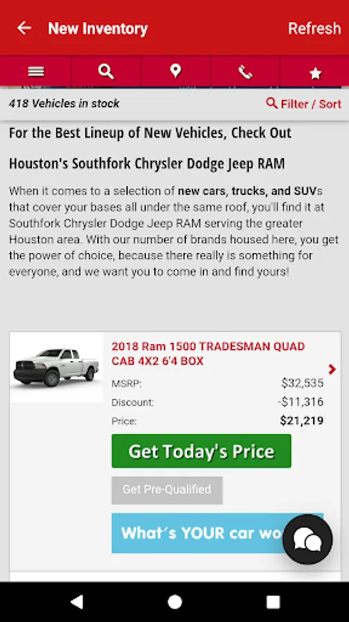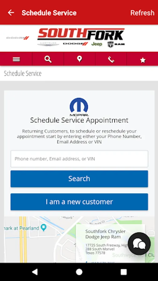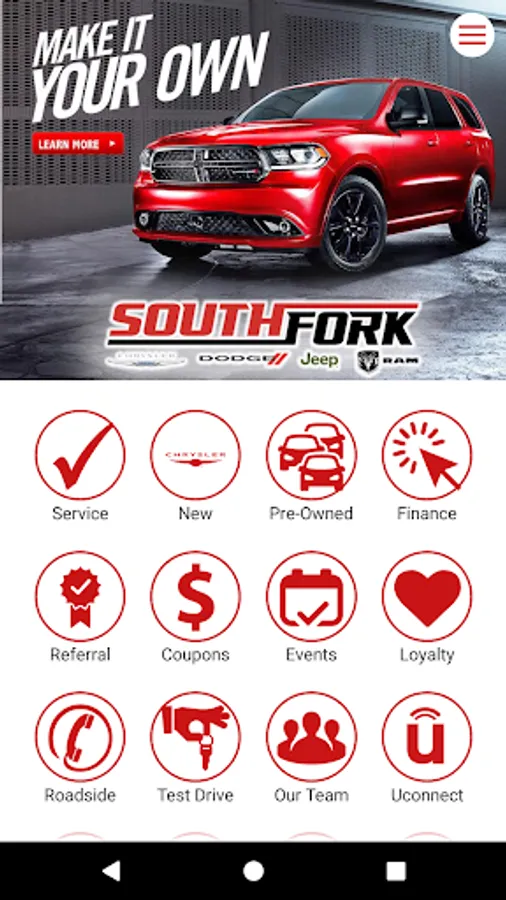Southfork Chrysler Dodge Jeep mobile customer engagement app provides customers with an enhanced dealership mobile experience. The app uses background geo-location for geo-fencing and geo-targeted push notifications to provide customers with relevant specials and loyalty offers. The app also delivers a wide range of features/benefits to customers, including service scheduling, viewing new and used inventory, redeeming mobile offers, sharing dealer promotions, viewing special events, contacting roadside assistance, booking a test drive, and contacting staff directory.