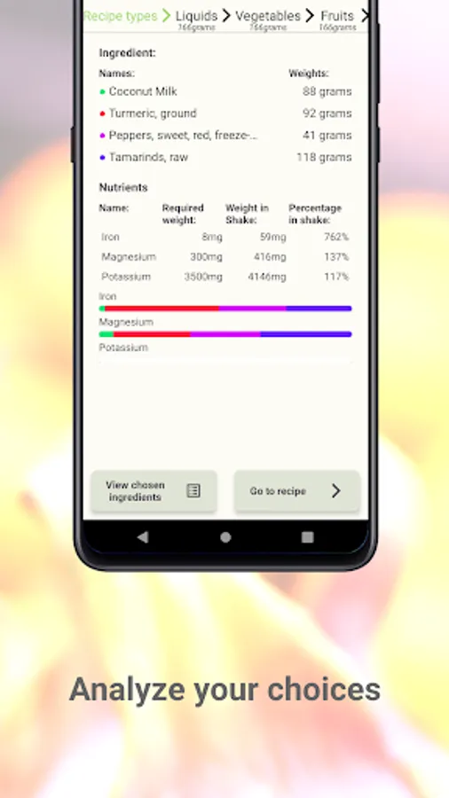 HealthShake allows you to input your own favourite smoothie recipes as well as create smoothie recipes from your own nutritional desires. By using sex and age HealthShake will suggest the daily requirements of nutrients suited for you. Then simply choose your desired nutrients and the app will suggest the best ingredients for your nutritional desires. Saved smoothie recipes provide nutritional information of the entire smoothie and show how much the nutrients cover of your daily requirements.