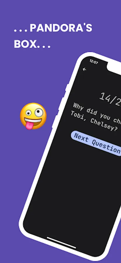 Enter Pandora's Box, the game mode that embraces anonymity and intrigue, no time for ice breakers here. Here, participants can ask each other anonymous and risqué questions without fear of judgment. It's a thrilling opportunity to delve into the depths of your friends' secrets and desires, all while maintaining the anonymity of the questioner. Unleash your curiosity and let the app ignite discussions, surprises, and hilarious revelations. Pandora's Box is the ultimate icebreaker, creating an atmosphere of trust and camaraderie among the participants.