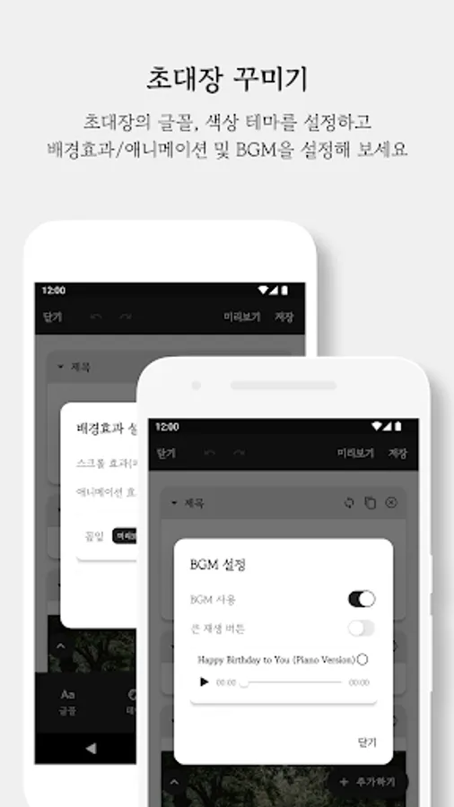 In addition to adding items, you can set the font, color theme, background effect, and BGM of the invitation.