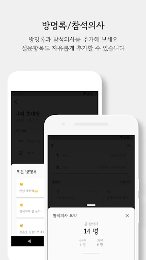 You can manage the guestbook created for each invitation and the intention to attend. Survey summary statistics are also provided according to the survey items added to the intention to attend.