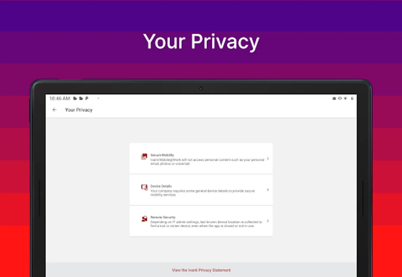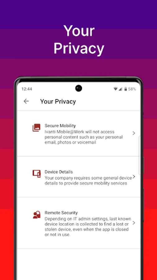 Note: Mobile@Work works in conjunction with Ivanti Core deployed by your company’s IT organization. Please follow the instructions from your IT organization to use this app. Mobile@Work is required to access corporate resources and therefore should not be removed without first consulting your IT organization. Visual Privacy allows your organization to see device details such as model name, OS version, roaming status, and company apps. However, IT cannot see personal information such as personal email, personal contacts, photos, videos and voicemail.