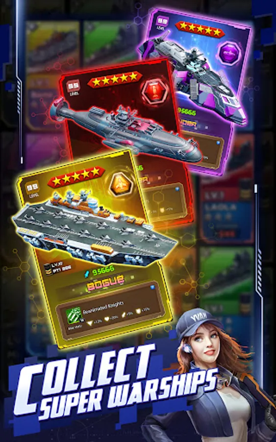 •Collect-Recruit hundreds of warships, submarines, carriers and naval commanders to build your fleet
