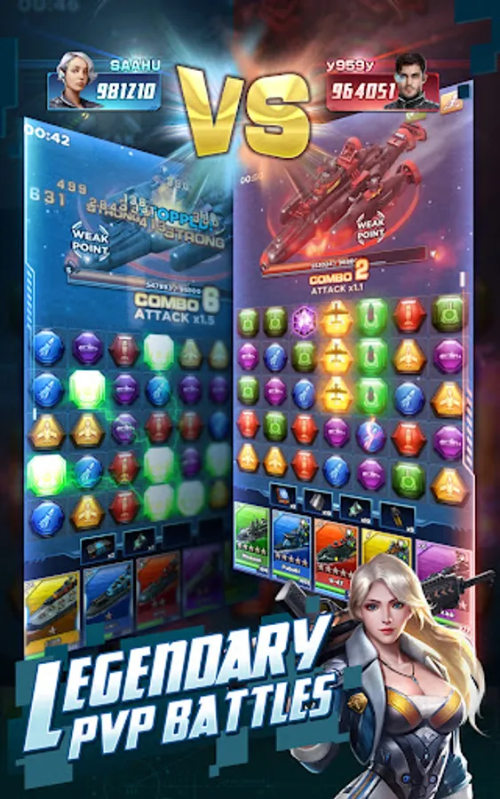 •Battle-Send your fleet to launch destructive attack by making match-3