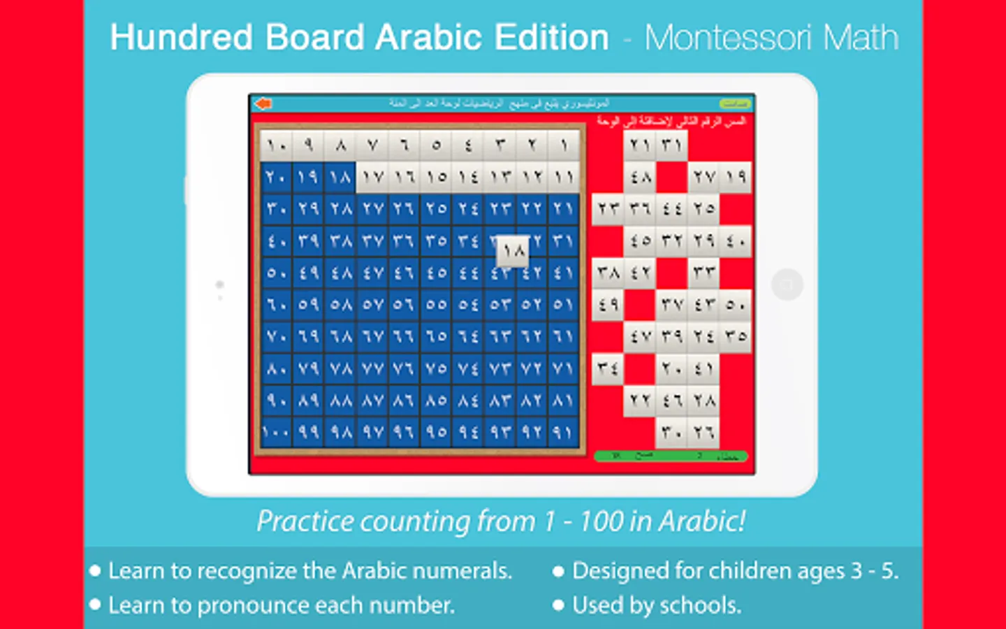 Use this app to help your child count from 1 to 100 in Arabic!