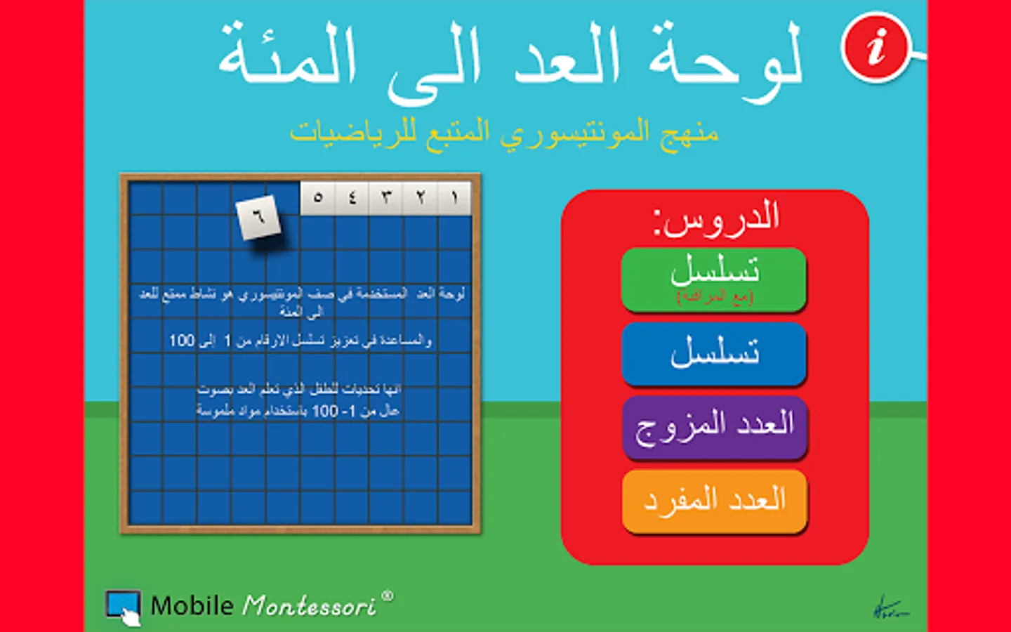 هذا التطبيق هو ممارسة ممتعه وتعليميه وجدت في صف المونتيسوري لمساعدة الأطفال بالعد من 1 الى 100. لوحة العد ومربعات الارقام هي نسخ طبق الأصل لهذه المواد الدراسية الكلاسيكية