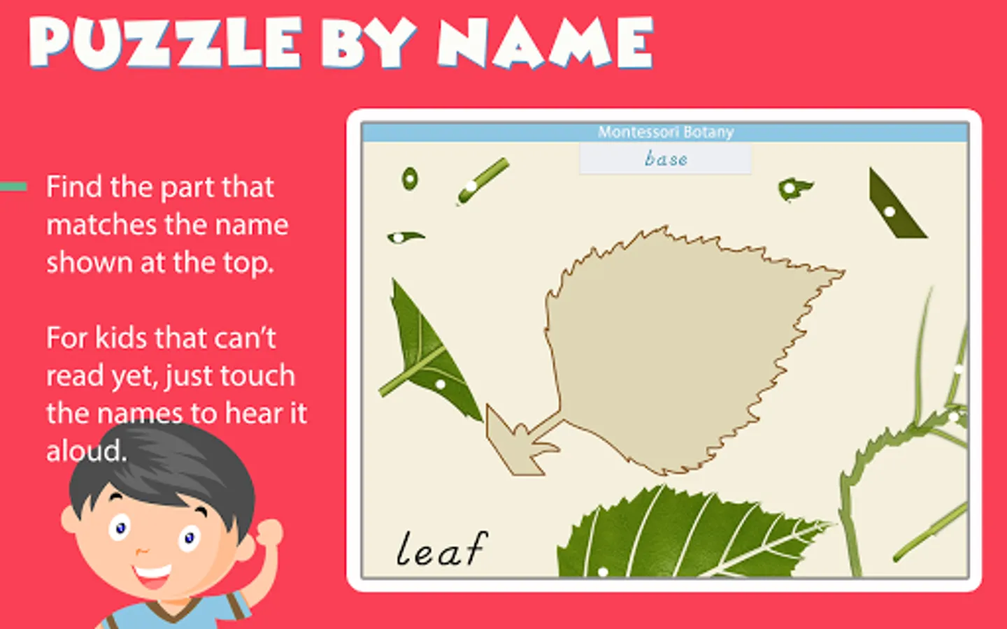 In the second plant puzzle lesson, children have to look for the plant puzzle piece that corresponds to the name shown at the top. For children who cannot read, the plant part name at the top can be touched to hear the name aloud for them to know which one to look for.