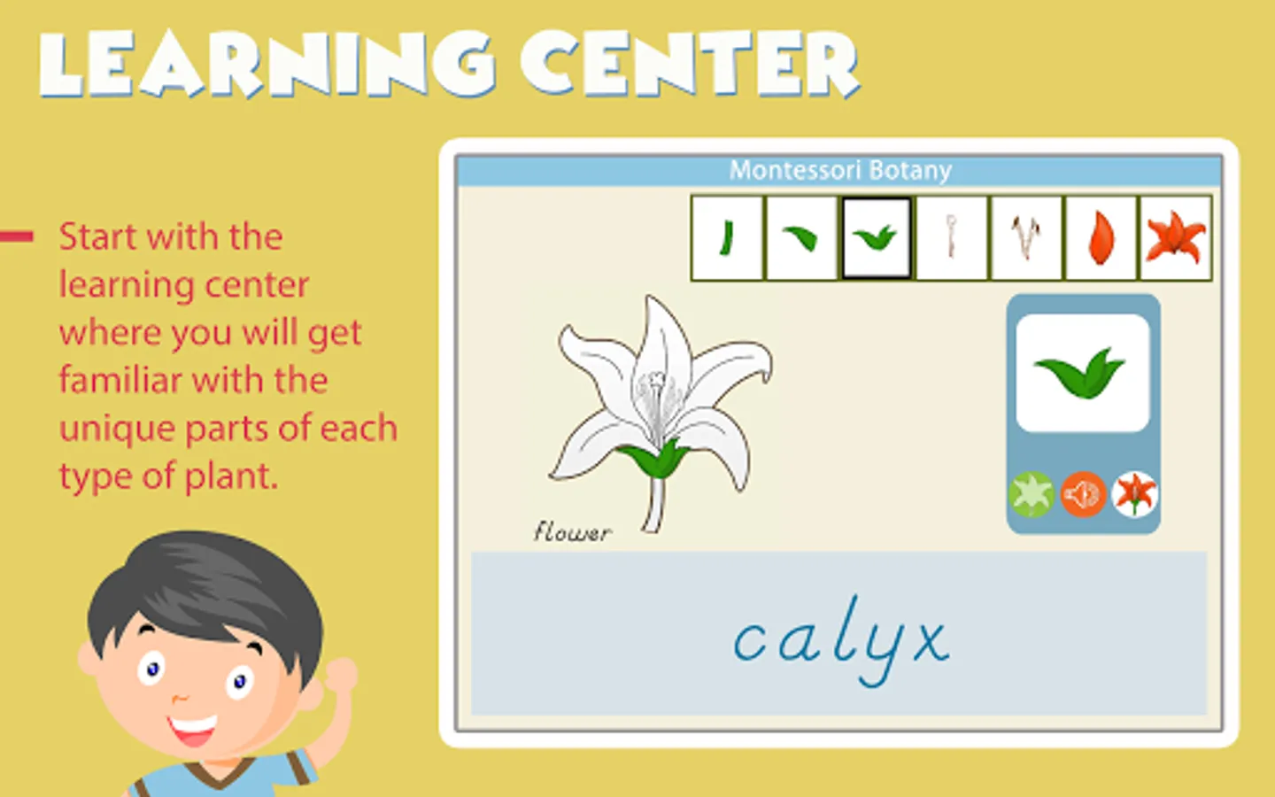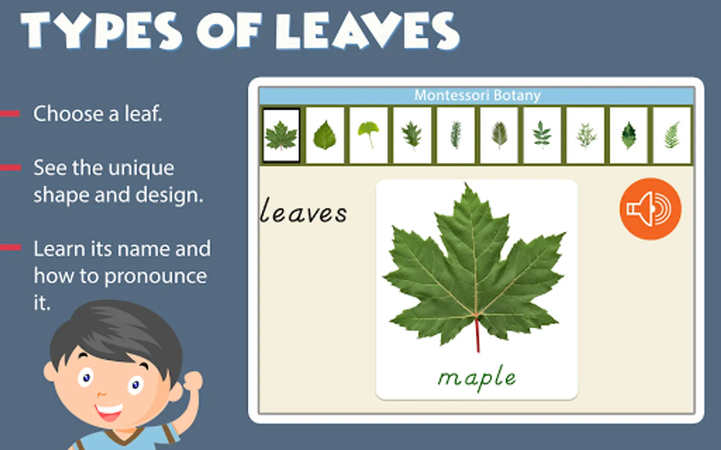 Touch a plant part in the photo-strip to change the featured plant part on the page. Touch the speaker button to hear the correct pronunciation of the plant part and touch the location button to see the plant part highlighted on the diagram! Also, learn the names of several different leaves and flowers.