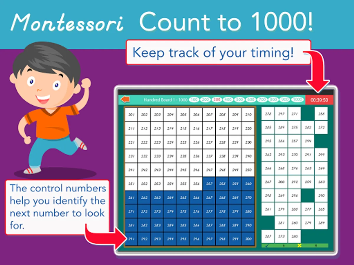 Practice counting straight through from 1 to 1000 with the choice of showing control numbers on the board or not. The app will keep track of your time. You'll be amazed at the engagement time with this app!