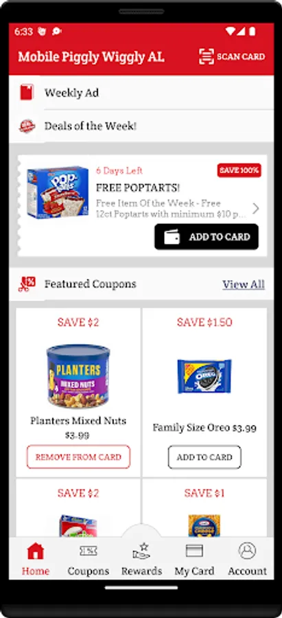 The Mobile Piggly Wiggly AL App is the easiest way for our loyal customers to receive savings and digital coupons every time they shop! The Mobile Piggly Wiggly AL App brings this all to your smartphone device with a simple and easy to use App. Saving in-store is simply and easy. Simply register for a new account, add coupons to your card on the app, and present the Mobile Piggly Wiggly AL App or type in your phone number at each transaction!