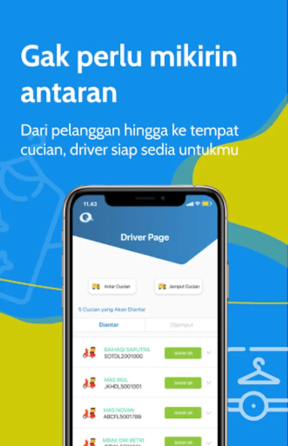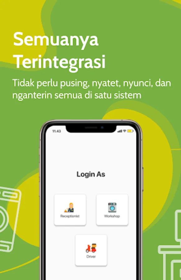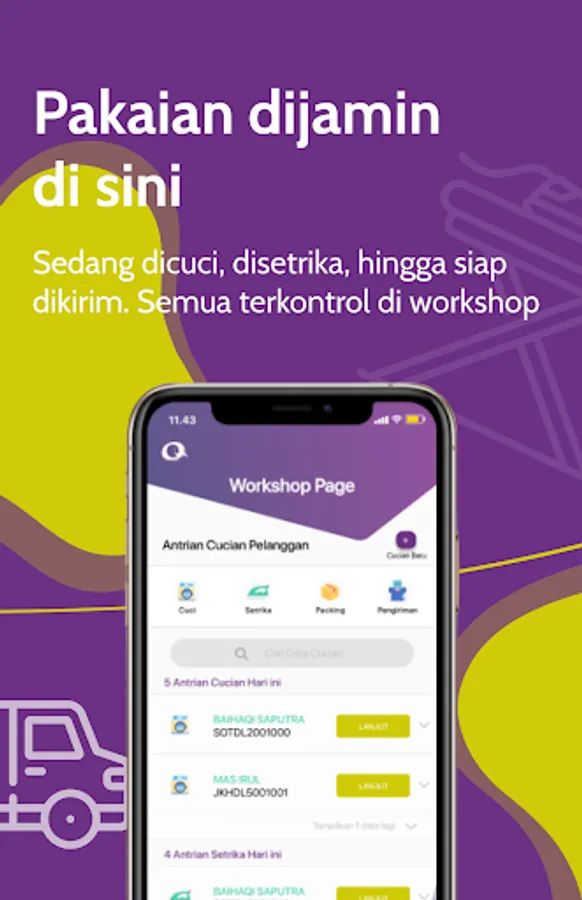 The QnC Laundry application provides complete management in doing laundry business, ranging from Receptionist, Delivery via Driver and Workshop to washing, ironing and packing.