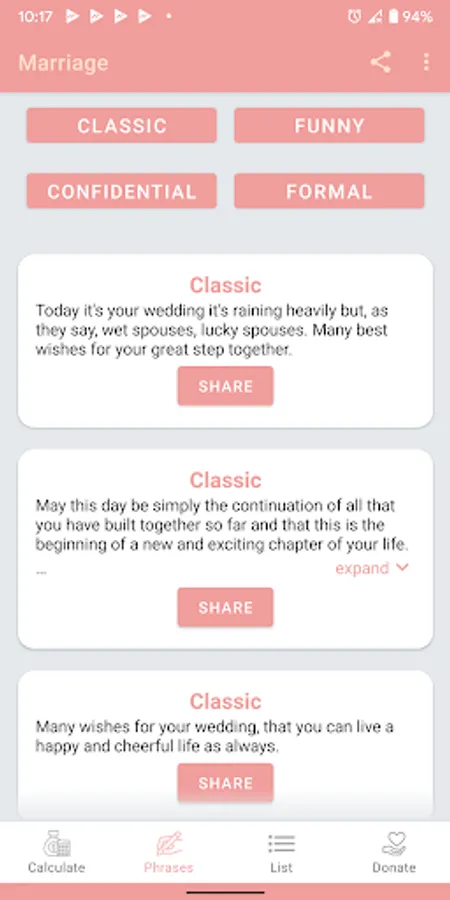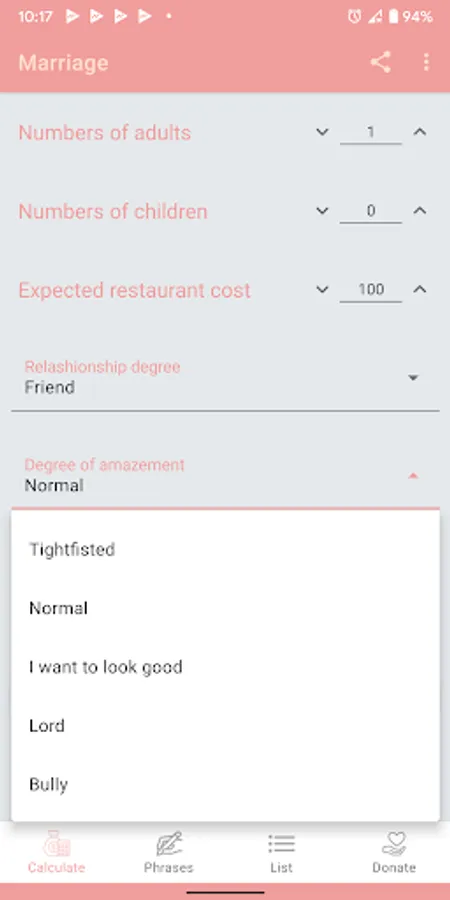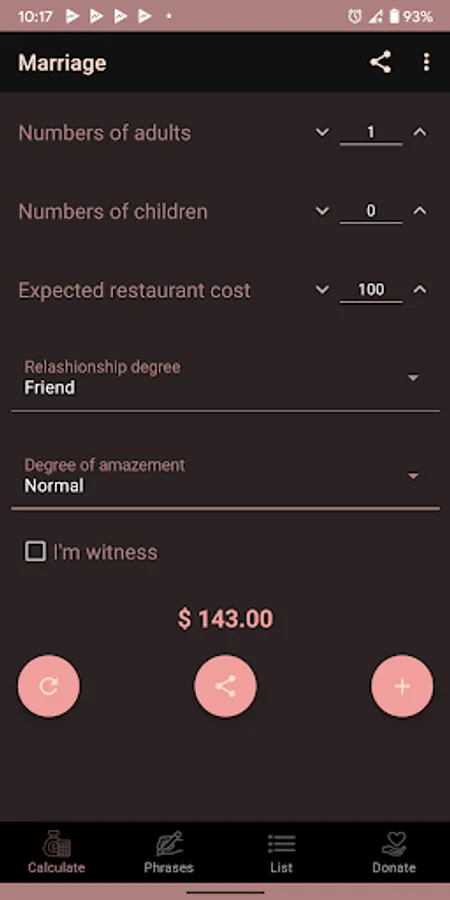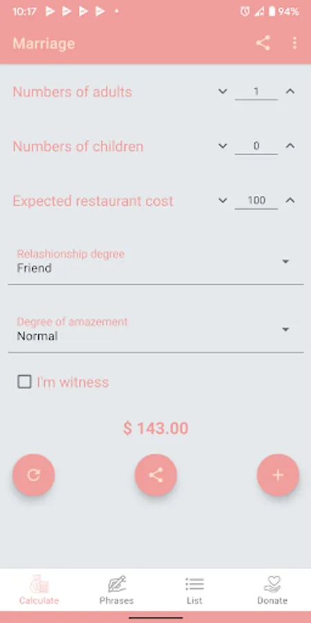 Have you received an invitation for a wedding? Don't despair. This app will help you in the calculation (according to a Made in Naples equation) of the envelope, so you will know the right amount for your gift, based on the components of the family and your personal needs, the amount generated can be shared with the your friends (so as to despair in a group). Dulcis in fundo: do you have little imagination? Don't worry, you will be able to generate random phrases for greetings, according to 4 categories.