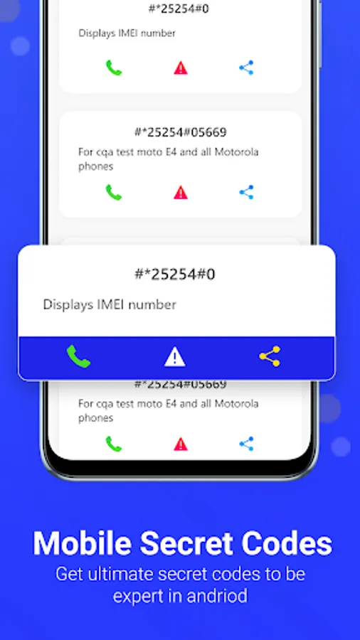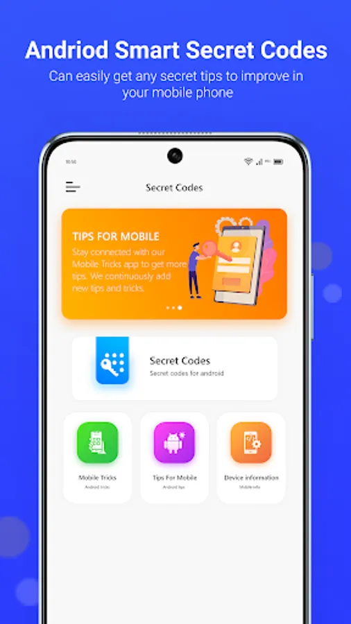 Mobile Secret Codes & Android Tips is designed to let you know about all hidden features and useful information about your mobile phone. Any type of device can work with Mobile Secret Codes – Android Tricks. All Secret Codes work automatically just click on desired Mobile Secret Code and it will automatically open in your mobile dialer. Android Secret codes can display many hidden and useful information about your mobile phone. Using the Mobile Secret Codes app you can increase your knowledge about all mobile phones and master yourself about any mobile hidden tricks or all mobile tips. Mobile Secret Codes developed to find latest technology Tips and Tricks with All Android Secret Codes for your android phone. You will get many secret codes and learn about many Android Tips and Mobile Tricks. All Mobile Secret Codes are explained step by step with all mobile manufacturer devices. Stay updated and connected with All Android Secret Codes – Tips & Tricks get more latest Secret Codes – Tips & Tricks. We continuously update Secret Codes with all new devices Tips and Tricks.