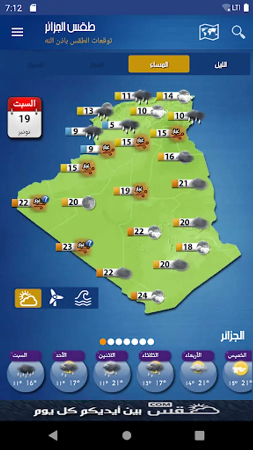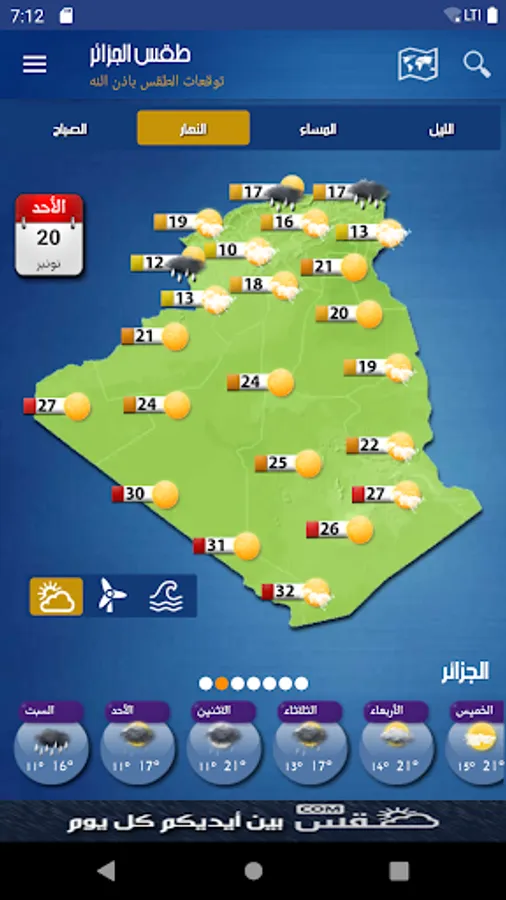 Get the weather forecast for the next seven days, through the application of Algeria Weather (weather, wind and humidity, ephemeris, and alerts) for many of the cities in Algeria. (Algiers, Oran, Constantine and Annaba Batna Blida Chlef Djelfa Setif Sidi Bel Abbes and a lot of other cities)