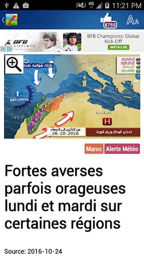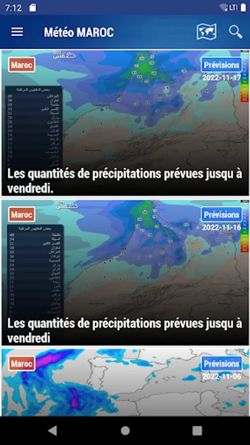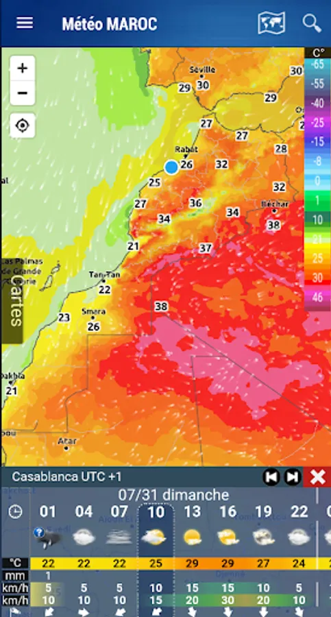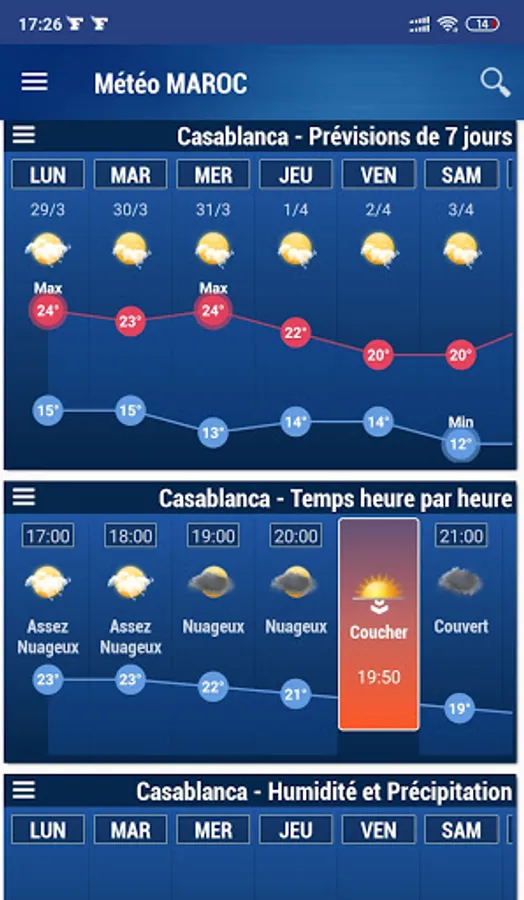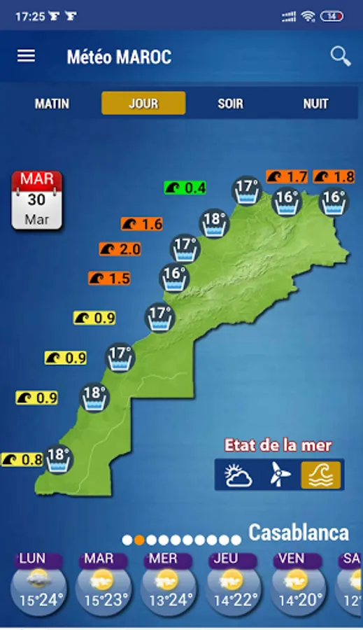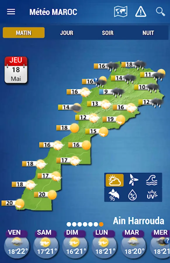 Morocco Weather app provides accurate weather forecasts (wind, humidity, tides, solunar activity, ephemeris, alerts) cities in Morocco for seven coming days.