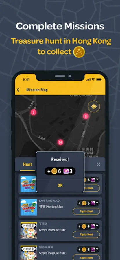- Hunt Mission: Start a treasure hunt adventure in different areas of Hong Kong to collect “Move Coins”, and also have chance to gain extra game items.