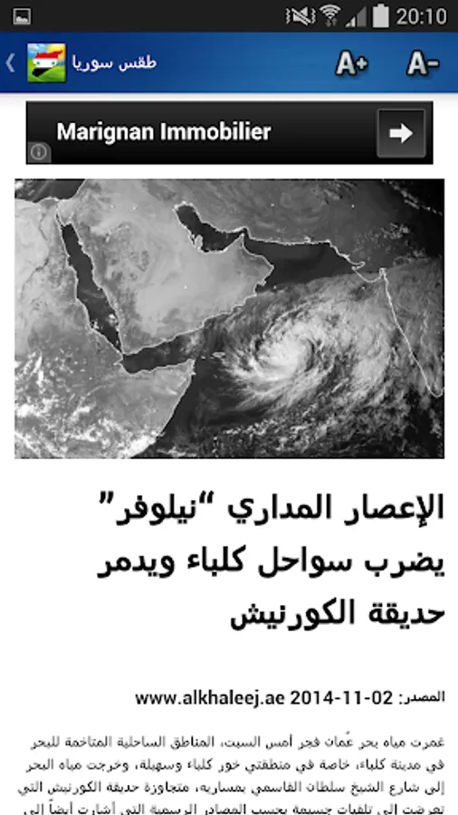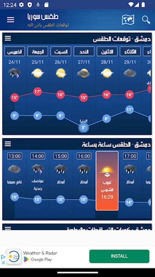 Syria Weather -Arabic- app provides accurate weather forecasts (wind, humidity, tides, solunar activity, ephemeris, alerts) cities in Syria for seven coming days.