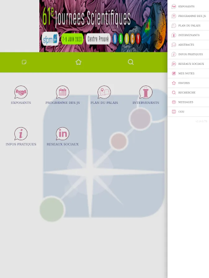 The three scientific days include 7 sessions devoted to radiotherapy, 2 sessions in medical imaging, 2 sessions in nuclear medicine, a one-day seminar in nuclear medicine, 2 sessions devoted to dosimetrists, 4 sessions have a theme common to the 3 disciplines and a session includes a debate of ideas.