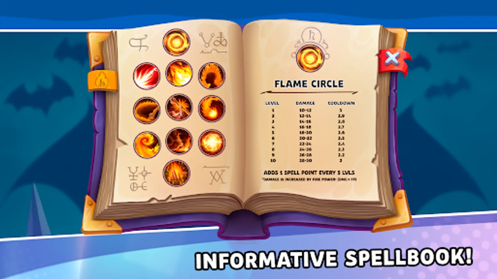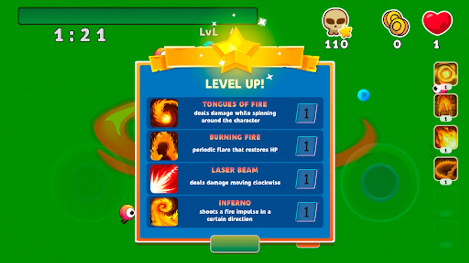 Your survivor will learn magic skills every time on level up. What will you do next - boost magic skill that you already have or learn a new one? It is only your choice. Read about all available skills in the spellbook to calculate your strategy before game.
