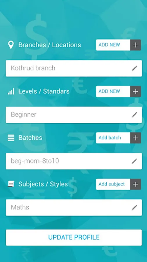 The App allows user to configure any coaching class - Dance , Music , Education. It supports multiple branches and subjects. User can track fees collected from each student. While taking attendance , RED marker is displayed besides a student who has not paid full fees.