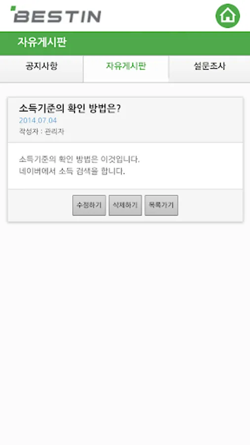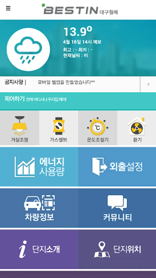It is a smart home exclusive app developed by BESTIN. It can connect to gas valve, door lock, lighting or heating control system as well as PC, and it provides home network service such as announcement and energy information.
