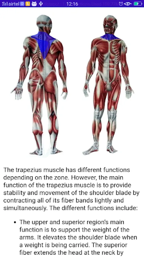 The trapezius muscle is located on the upper back of the body. The trapezius is a large muscle that forms part of the upper back, neck, and shoulder. The muscle is flat, wide, and superficial and it originates from the occipital bone which forms the base of the skull and the back. The connection points of the trapezius muscle are the clavicle, acromion and the shoulder blade.