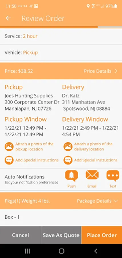 Order entry has never been easier. Add your packages, find addresses based on your GPS location, review your cost and pay right from the app. Place orders in seconds, or drill into more details like scanning barcodes to add packages, attaching photos to stops, and setting up your notifications.