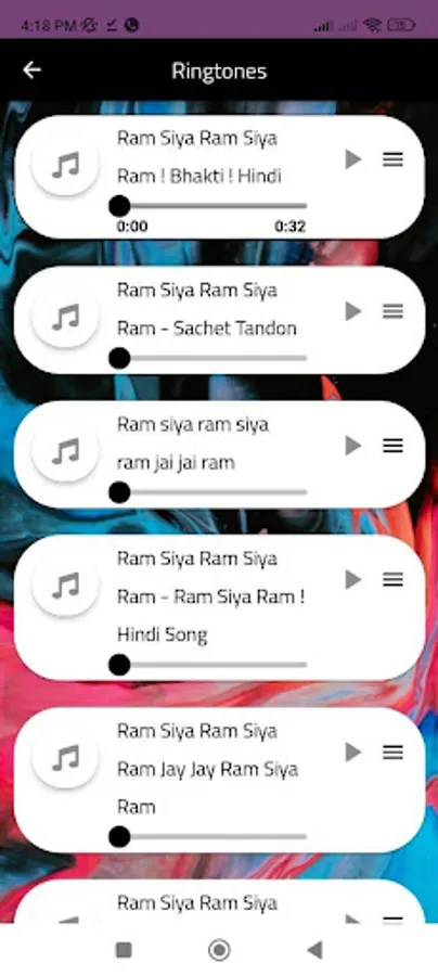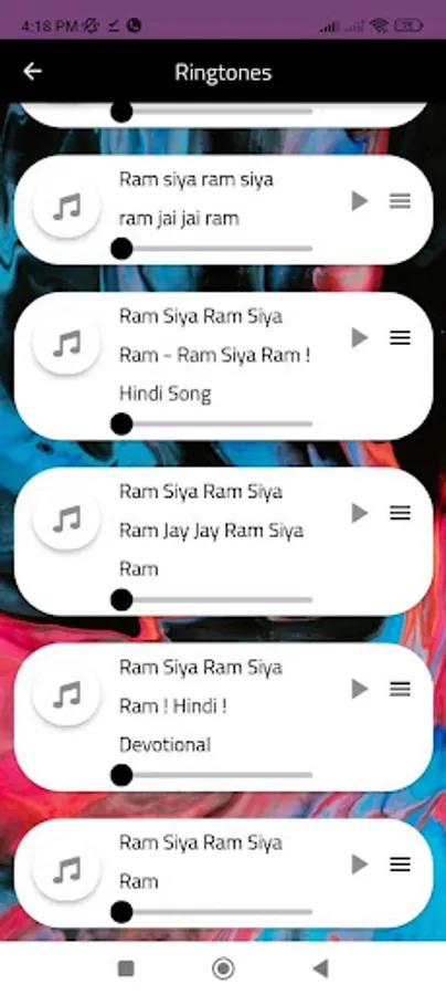 "Ram Siya Ram" ringtones are musical renditions of this chant that are designed to be used as ringtones on mobile phones. These ringtones typically feature melodic and rhythmic arrangements of the chant, often accompanied by traditional Indian instruments like the sitar, tabla, and flute.