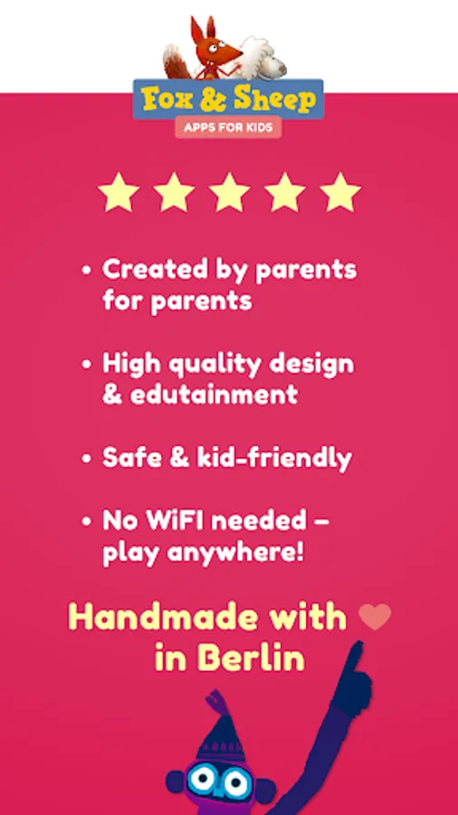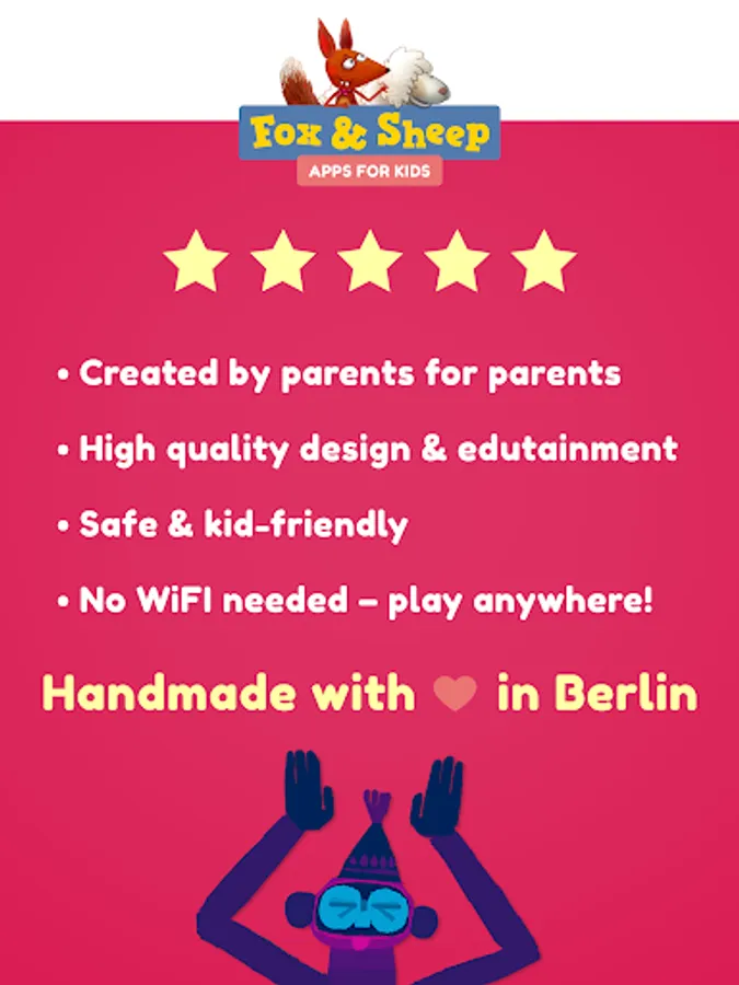 We are a Studio in Berlin and develop high quality apps for kids at the age of 2-8 years. We are parents ourselves and work passionately and with a lot of commitment on our products. We work with the best illustrators and animators around the world to create and present the best apps possible – to enrich the lives of our and your kids.