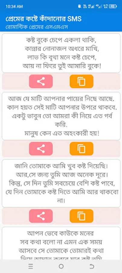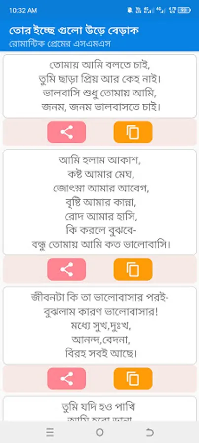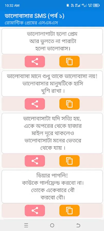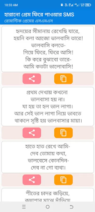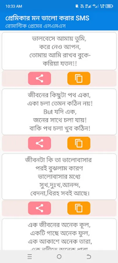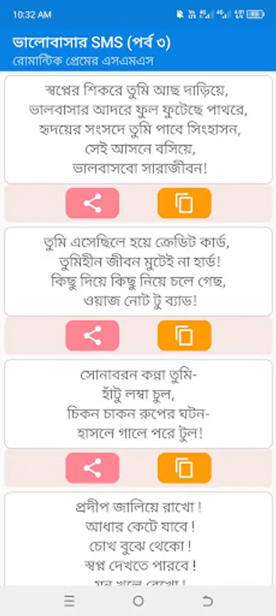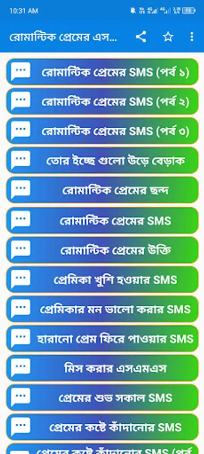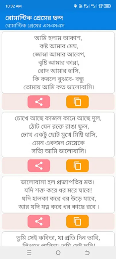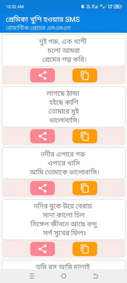 Sometimes love comes in the life of every person. But because of shame or fear, he can't tell the people of his love. To express this feeling of love with the heart, some rhythmic romantic love sms is needed. You will get all those sms in our app. Through which you can express your feelings of love to the people in your heart. This app is very easy to use. If you want, you can copy the text and send it or send it directly by clicking on the send button.