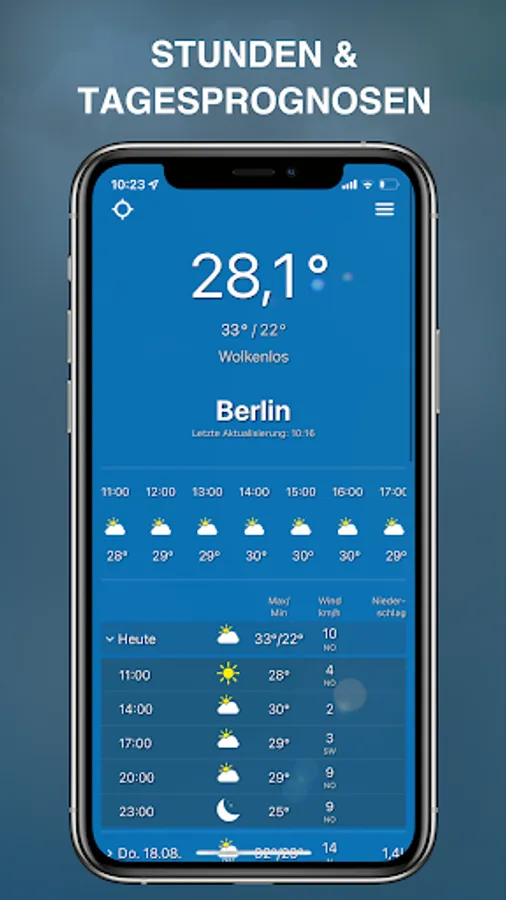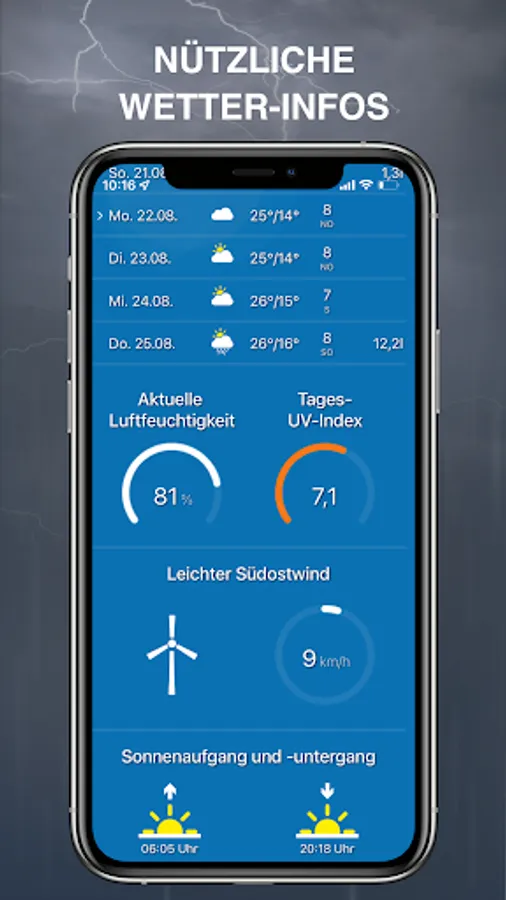 The app is easy and intuitive to use and focuses on the essentials. You always have an overview of the current weather at your current location and can add other locations at any time with one click.