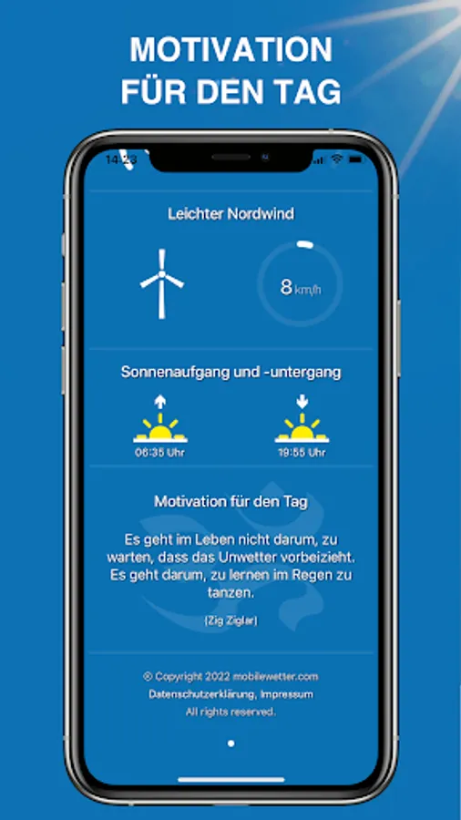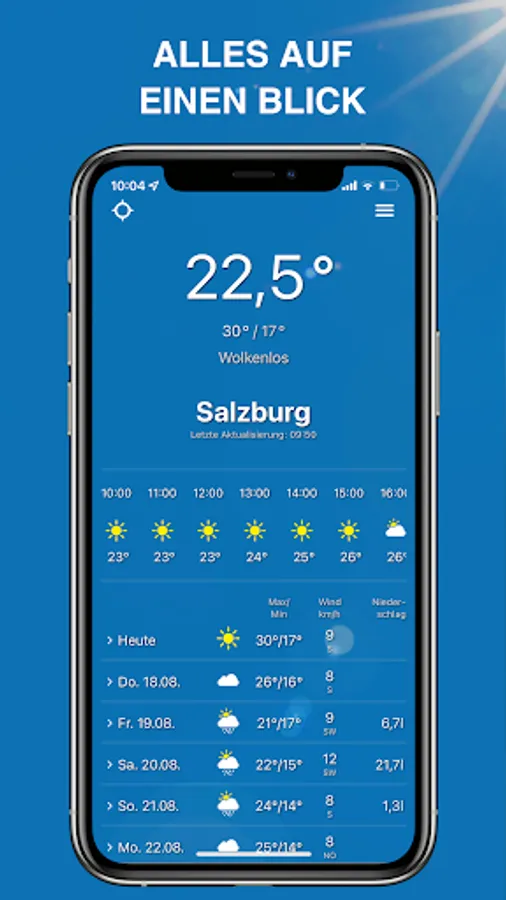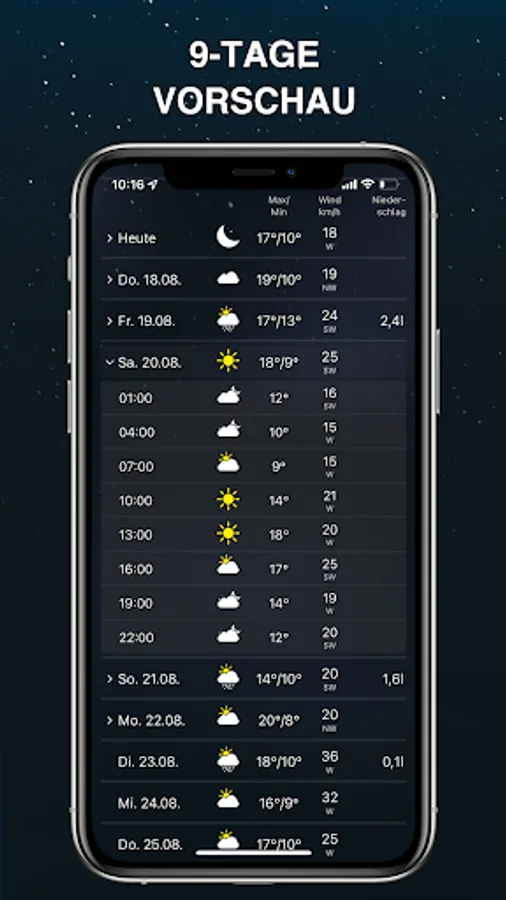 In addition to the current weather, you also get the weather forecast for the next 9 days with lots of additional information.