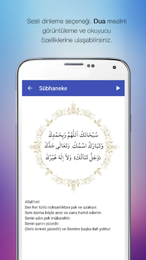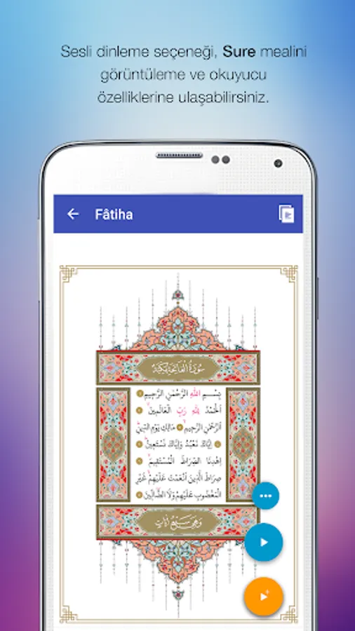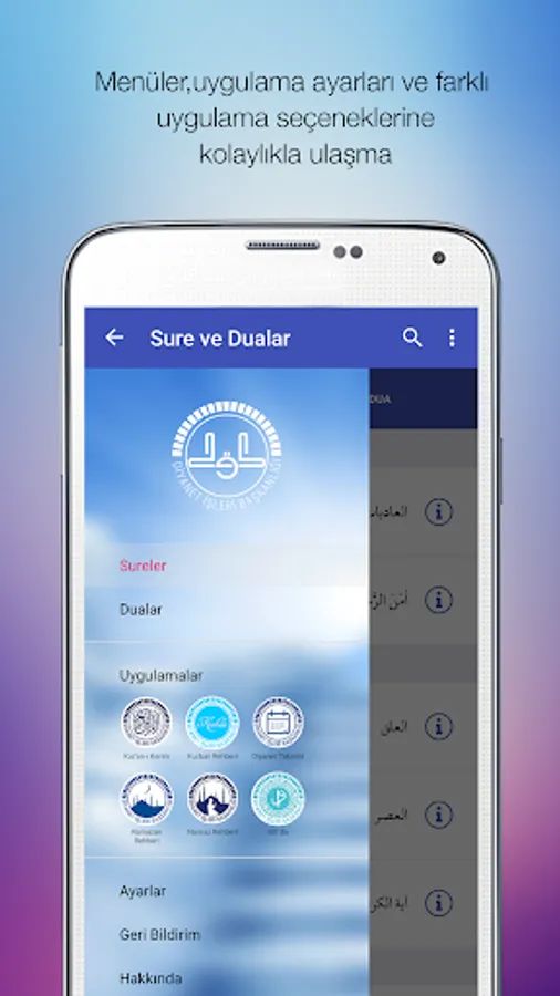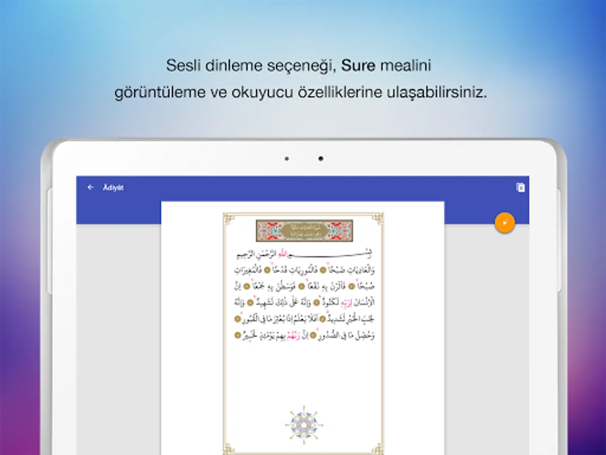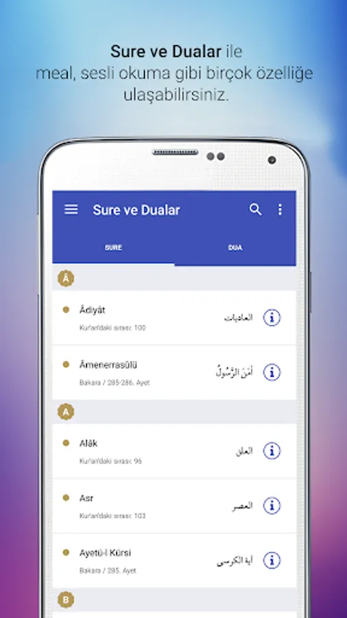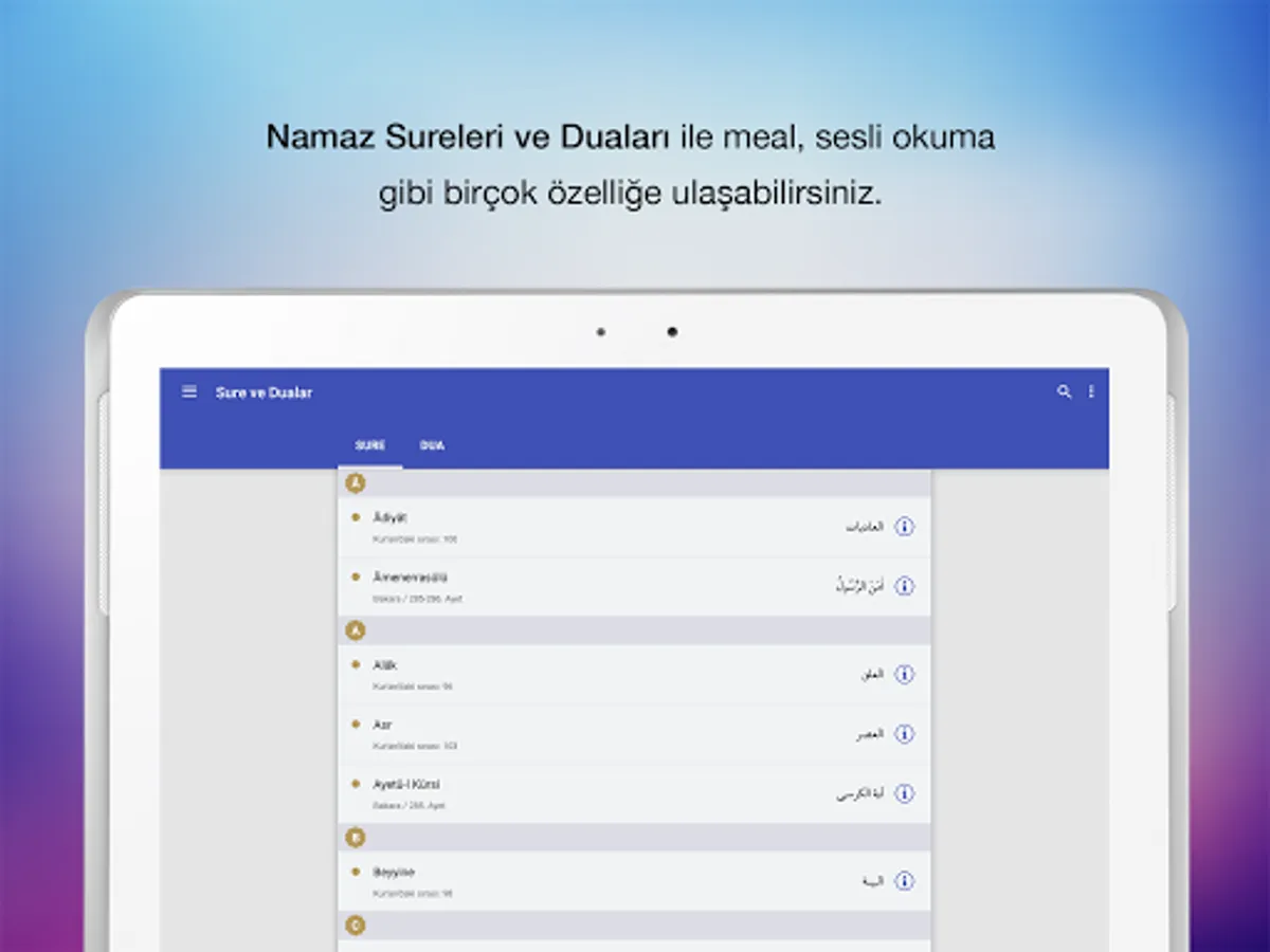 Sura and Prayer reading, Sura and Prayer search, Surah alphabetical order and the order of the Qur'an feature, summary information about Surah, Surah verse verse listening feature, Prayer Listening