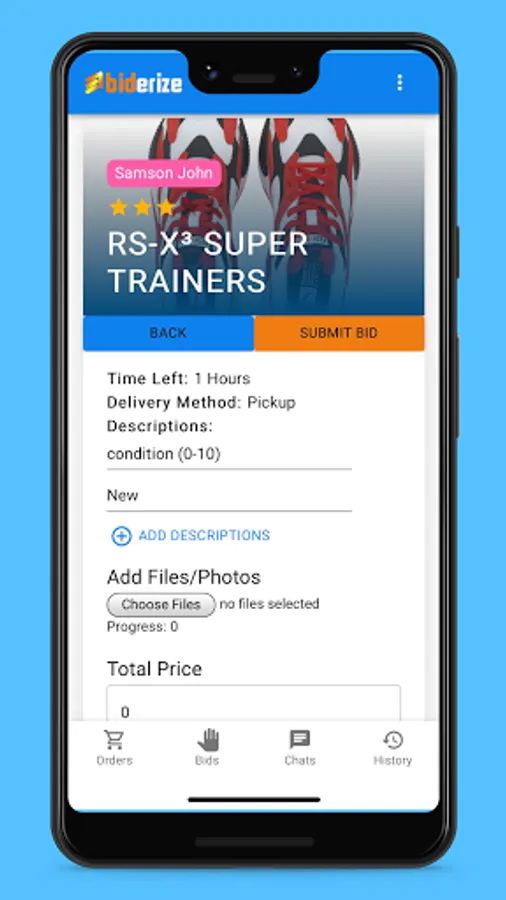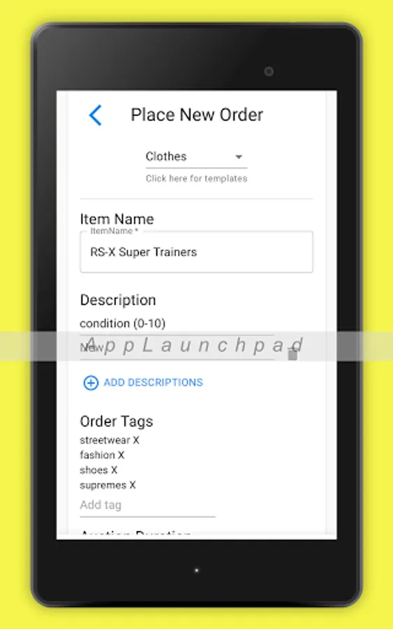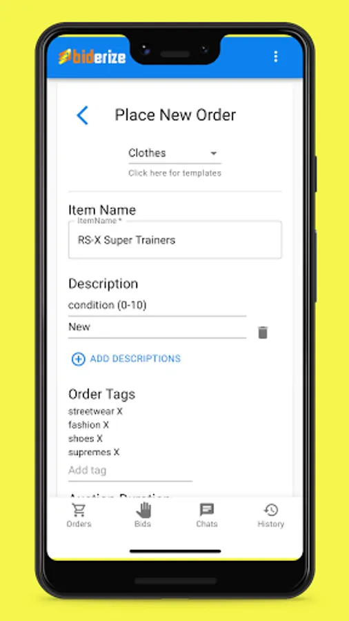 Just add a name, description, picture (optional), and a list of tags you want to post to. Any users following those tags will instantly get a notification for your order and decide if they want to bid to sell you that product or service. This tool is completely free and works great for secondary market items such as autoparts, clothes, trading cards, collectibles and many more.