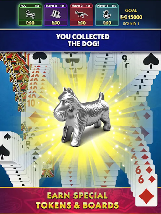 In MONOPOLY Solitaire, completing deals of solitaire earns dice rolls and MONOPOLY board game points to send players off on the chase for fortune. As you make your way around the board, collect properties to build houses and hotels as you establish your real estate empire. Progress through the game and avoid jail to unlock your favorite tokens from the actual MONOPOLY board game. With endless solitaire levels to complete, the fun is limitless!
