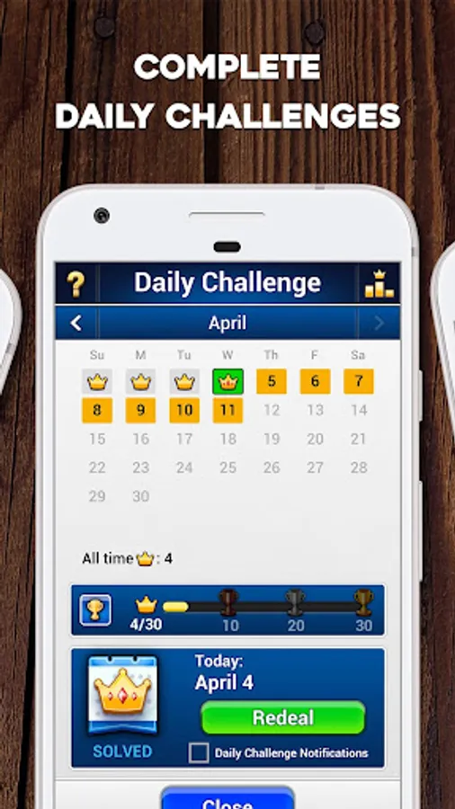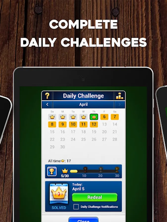 We are the original creators of Daily Challenges! Each day you’ll receive a unique Daily Challenge. Solve the Daily Challenge and receive a crown for that day. Earn trophies each month by winning more crowns! Your Daily Challenges, crowns, and current trophy status are available to view any time. Play the current day’s deal and replay it as many times as you’d like on that day.