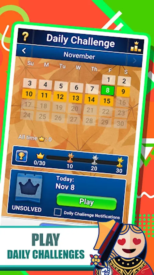 - Progress through challenging solitaire card puzzles with daily goals and challenges!
