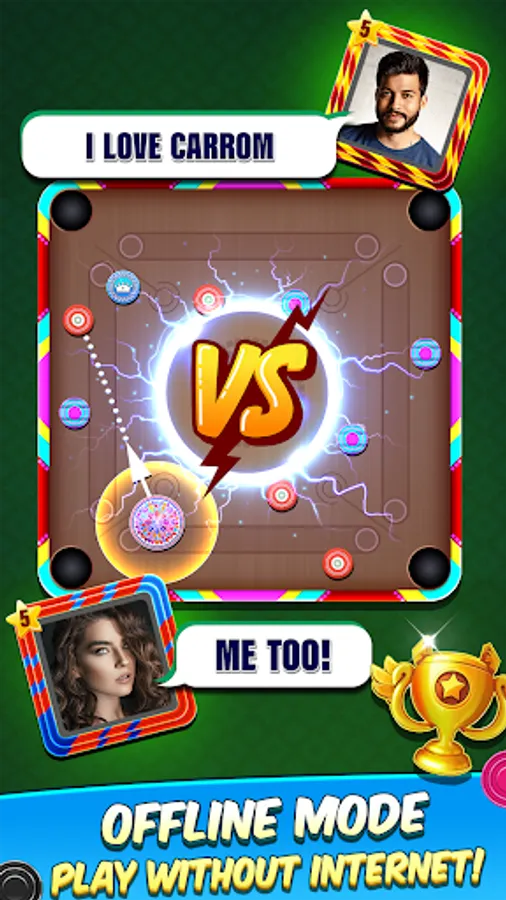 Carrom or Karrom or caram, an Indian version of pool or billiards, play easy-to-play offline board game. Carrom features three challenging game play modes Freestyle, Black & white and Disc pool.
