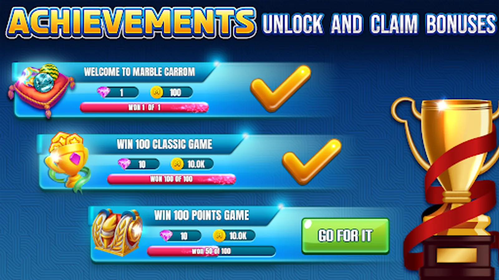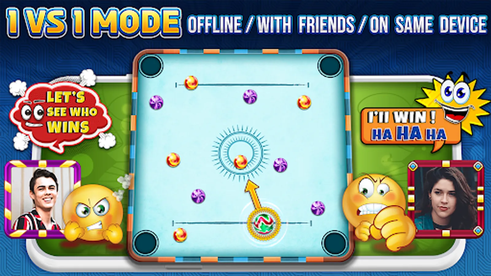 Marble Carrom is a game that remembers your childhood. Excellent features, Elegant graphics, and Entertaining gameplay which all you need in one game. it also includes spin wheel, Challenging achievements, and powerful equipment to improve your game.