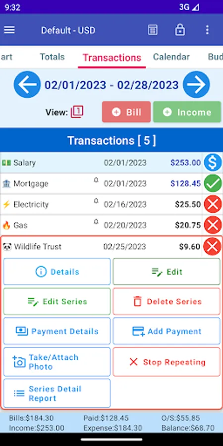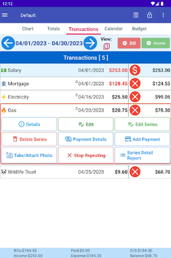 * Take a photo of your bills, income and receipts and attach to a transaction