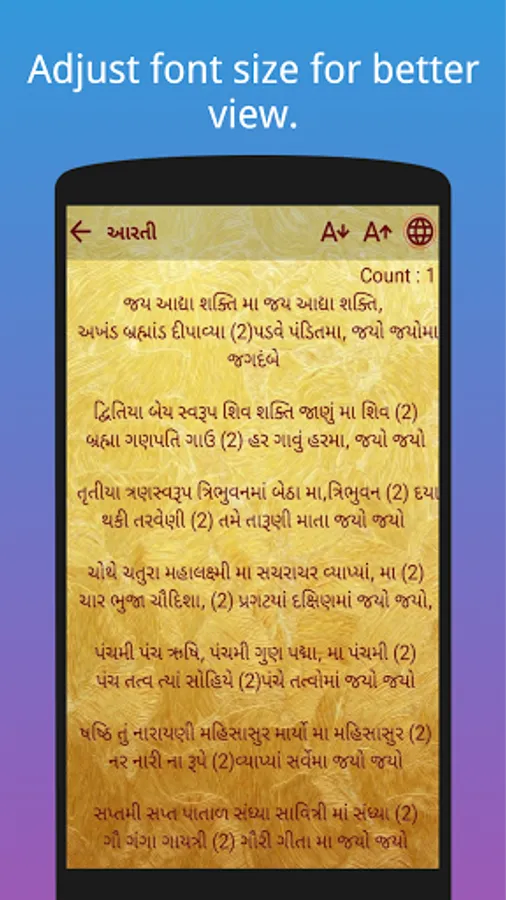 Languages Support: Currently Ambe maa aarti, Ambe maa stuti and Ambe maa thal has 3 language support. Gujarati, Hindi, and English. Easy to change language at the time of prayer for Maa Ambe.