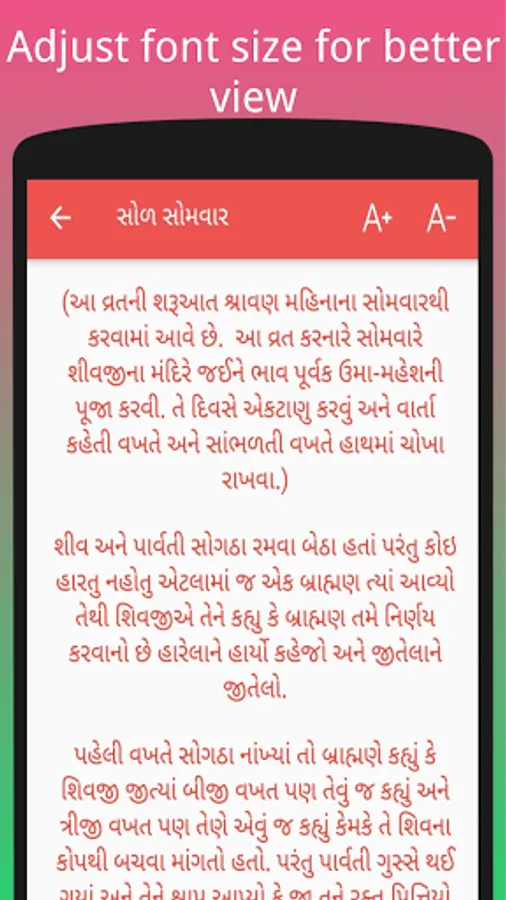 Vrat Katha is a collection of Vrat Katha in the Gujarati Language. Here you can find a large collection of Vrat Katha (fast stories) like – Somvar Vrat Katha, Shivratri Vrat Katha , Gauri puja, Kevda trij Vrat Katha , Jaya Parvati Vrat Katha,Shitla Shatam Vrat Katha, Ganesh choth Vrat Katha , Vat savitri Vrat Katha , Dashama Vrat Katha , Nag pancham Vrat Katha , Bol choth Vrat Katha and many other Vrat Katha available in Gujarati language. Use this app online as well as offline / without internet.