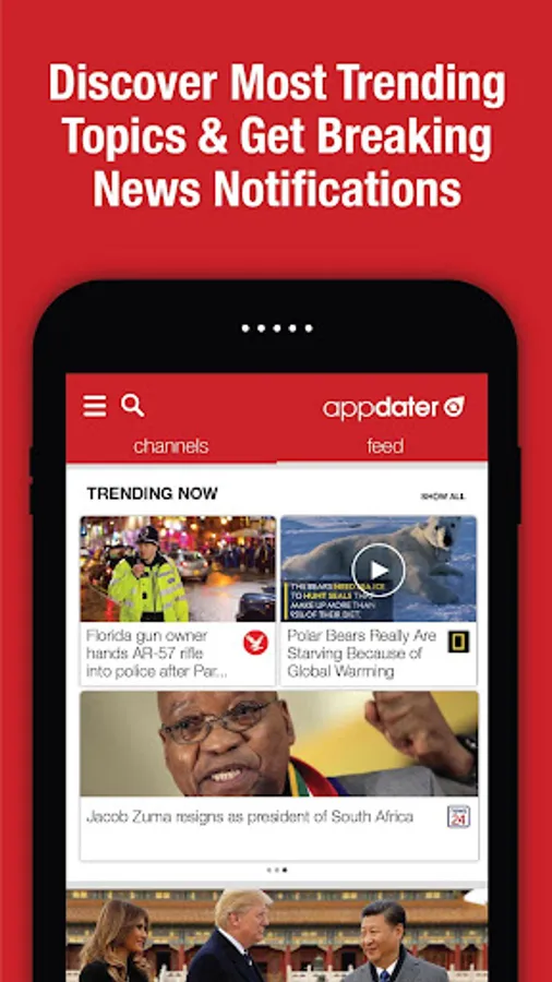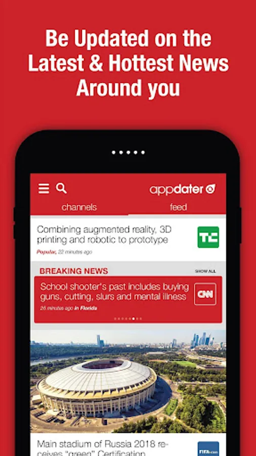 Appdater is a customized news app that allows you to discover breaking news, trending topics, to view the latest videos, and to be updated on all news happening around you.