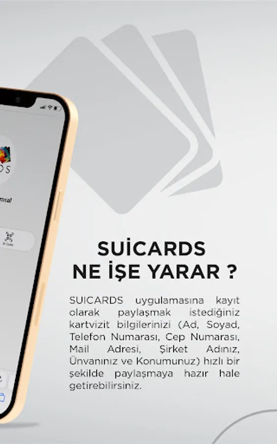 By registering with the SUICARDS application, you can quickly prepare your business card information (name, surname, phone number, mobile number, e-mail address, company name, title and location) that you want to share with the others. Moreover, this information is recorded directly on the phone of the people you share with.