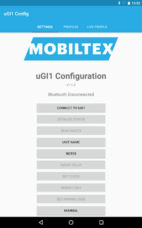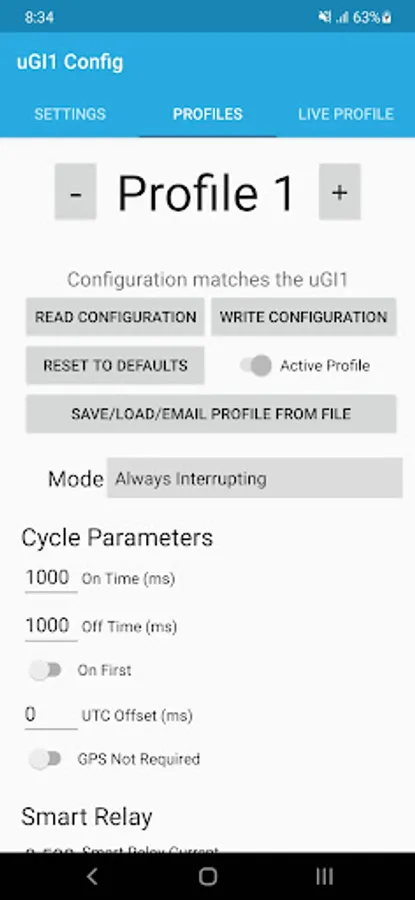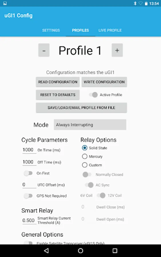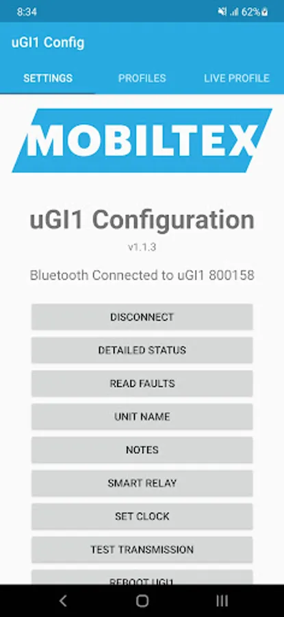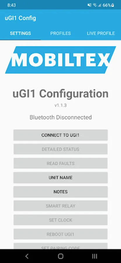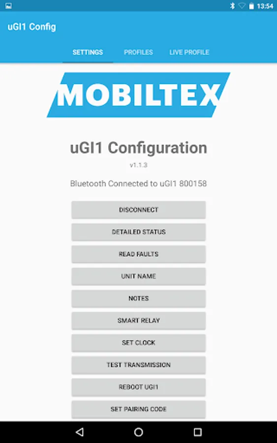 The app has two tabs, a 'Settings' tab and 'Profiles' tab. The 'Settings' tab allows for seeing a detailed status of the device, any recent faults that have arisen, manually setting the Real Time Clock (RTC), setting the unit's name, adding notes and rebooting the device. The 'Profiles' tab allows for the custom configuration of up to 10 independent profiles. It can read/write them from/to the unit and set their values. In addition, the profiles can be reset to their default values.