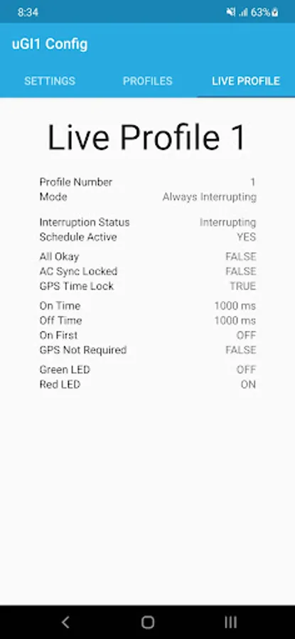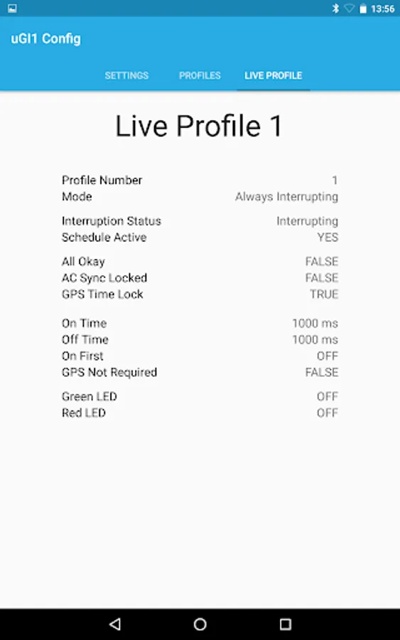 This app is for configuring the uGI1 (Micro GPS-enabled Interrupter 1). The uGI1 is used to monitor and control a cathodic protection rectifier by switching a relay at precisely scheduled intervals. This app allows access to basic information on the uGI1 and allows setting up 10 different profiles to meet the customer's needs. Note that logs, due to their size, can only be extracted from the uGI1 using the PC configuration application through the USB port.